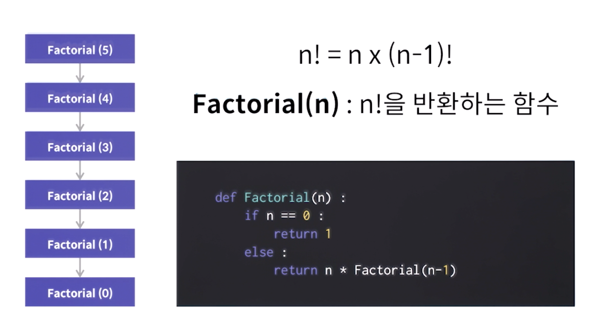 만약 팩토리얼 5를 구한다고 가정한다면, 팩토리얼 5는 4를, 4는 3을 호출하는 식으로 하여 팩토리얼 0까지 호출하게 됩니다.