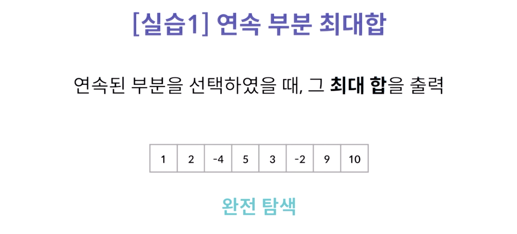 모든 연속 부분을 구하는 경우 O(n^2), 연속 부분의 합을 구하는 과정이 O(n)이므로 완전 탐색으로 해결한 연속 부분 최대합 문제의 시간복잡도는