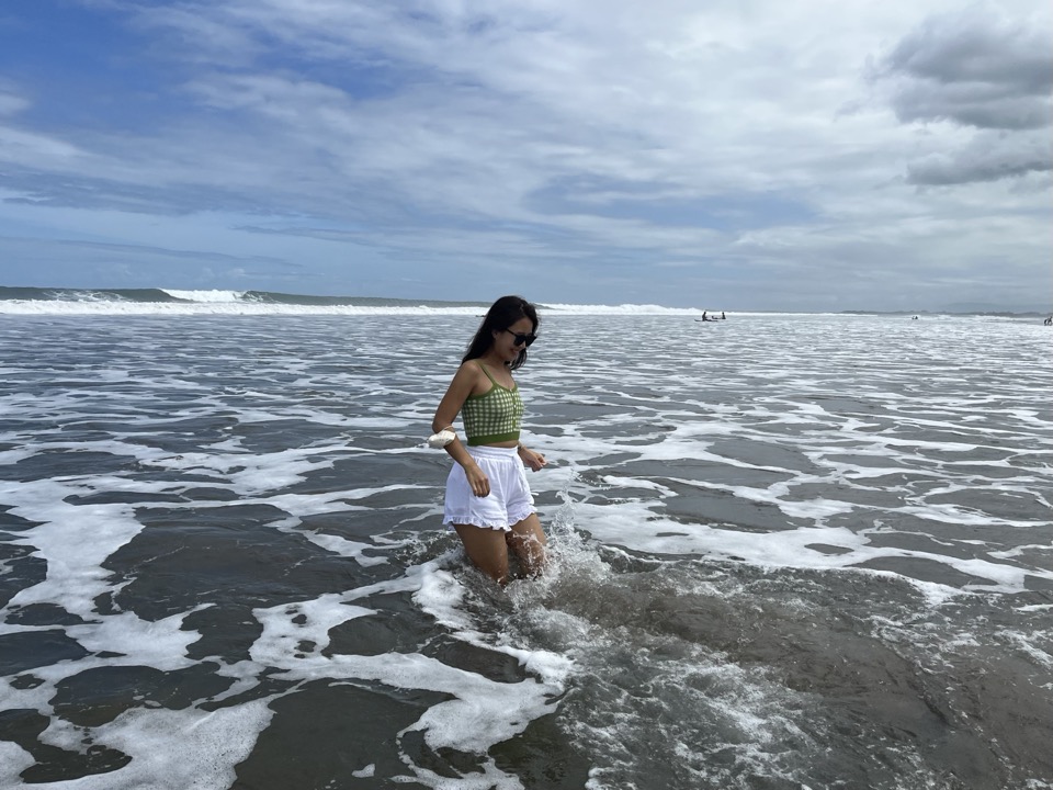 아침식사 후 바닷가 산책 중. 까만 모래라 수질이 나빠보이지만 물도 맑고 파다도 높은 편이라 뒤에 보이는 것처럼 서핑하기에 좋은 파다였습니다.