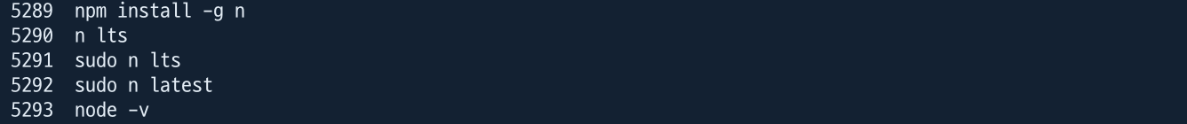 5291, 5292 행의 sudo n lts/sudo n latest라는 명령어로 Node 버전을 최신 버전으로 업데이트를 해주게 됩니다.