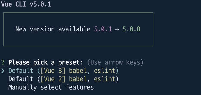 위, 아래 화살표키로 Default가 될 바벨 웹팩과 eslint 버전을 선택할 수 있는데, 여기서 Vue 3를 선택하기 위해 엔터 입력