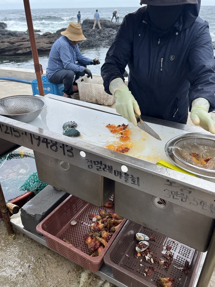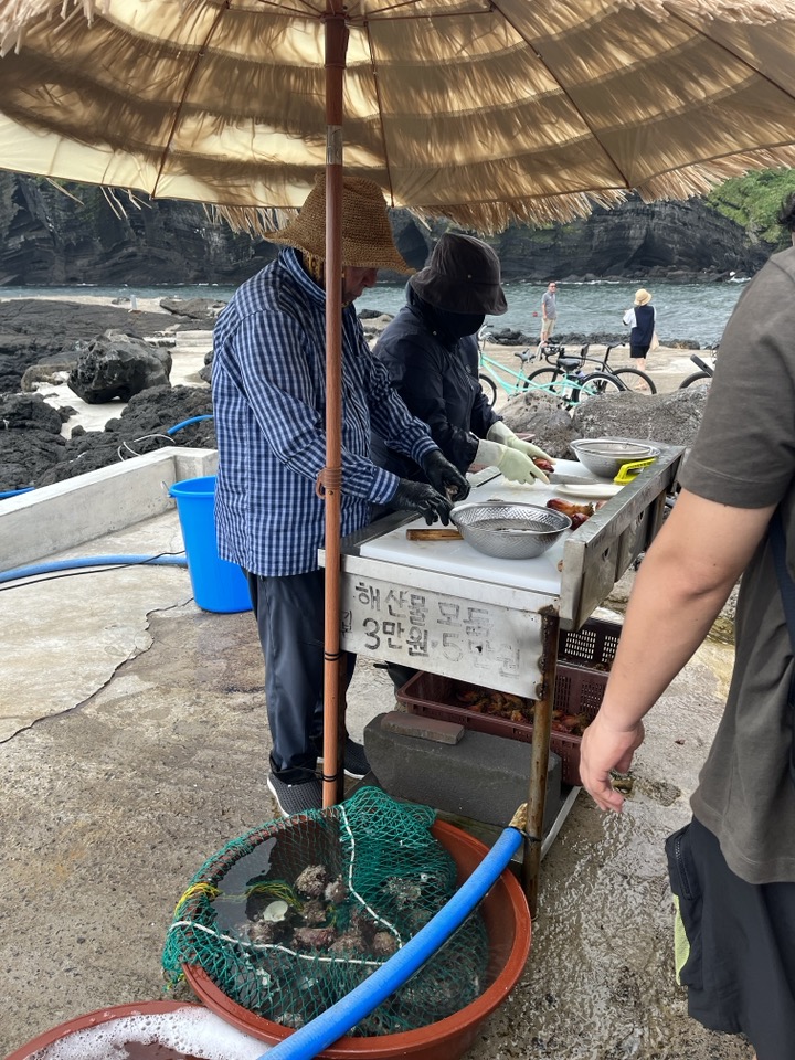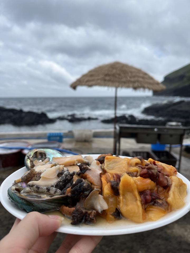 자연산 전복에 멍게, 그리고 뿔소라 모둠접시는 3만원. 해변 바로 옆에 위치한데다가 술까지 마실 수 있는 진짜 찐찐 야장감성이지만