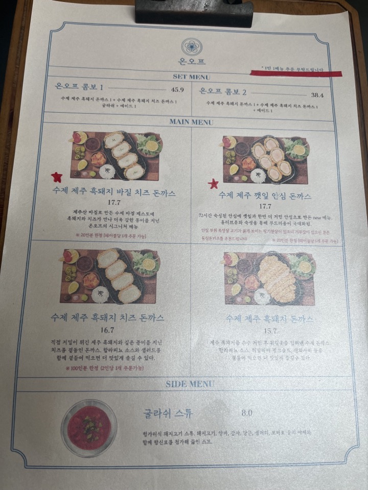 시그니처 메뉴 하나씩 시켜봤어요. 오픈런한 이유였던 흑돼지 바질 치즈 돈까스(20인분 한정)부터 깻잎 안심 돈까스까지 거를 타선이 없습니다.