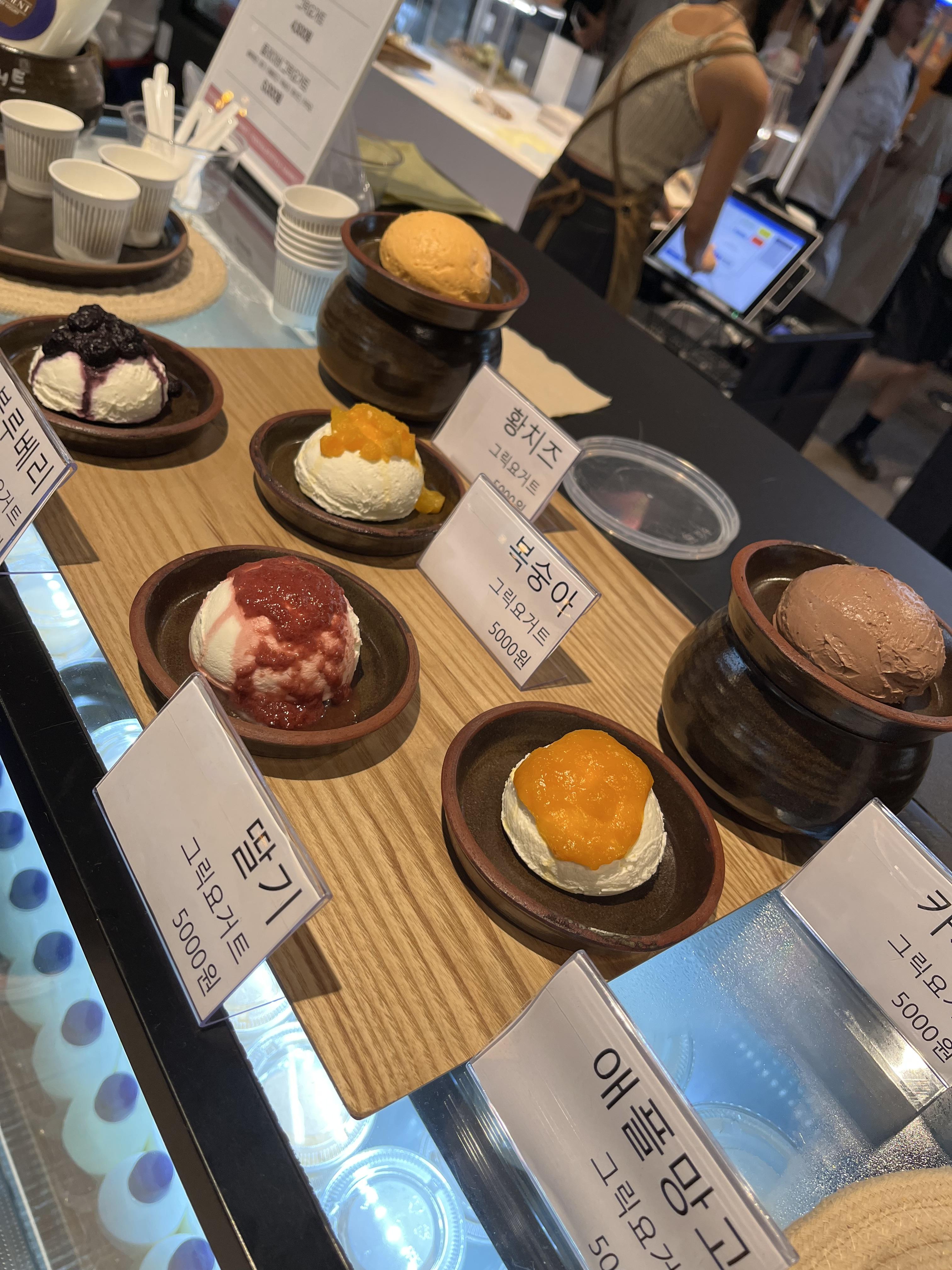 항아리 숙성 그릭요거트 맛집입니다. 카카오와 일반 그릭요거트를 시식해보았는데, 요거트가 쫀득하고 맛있어요.