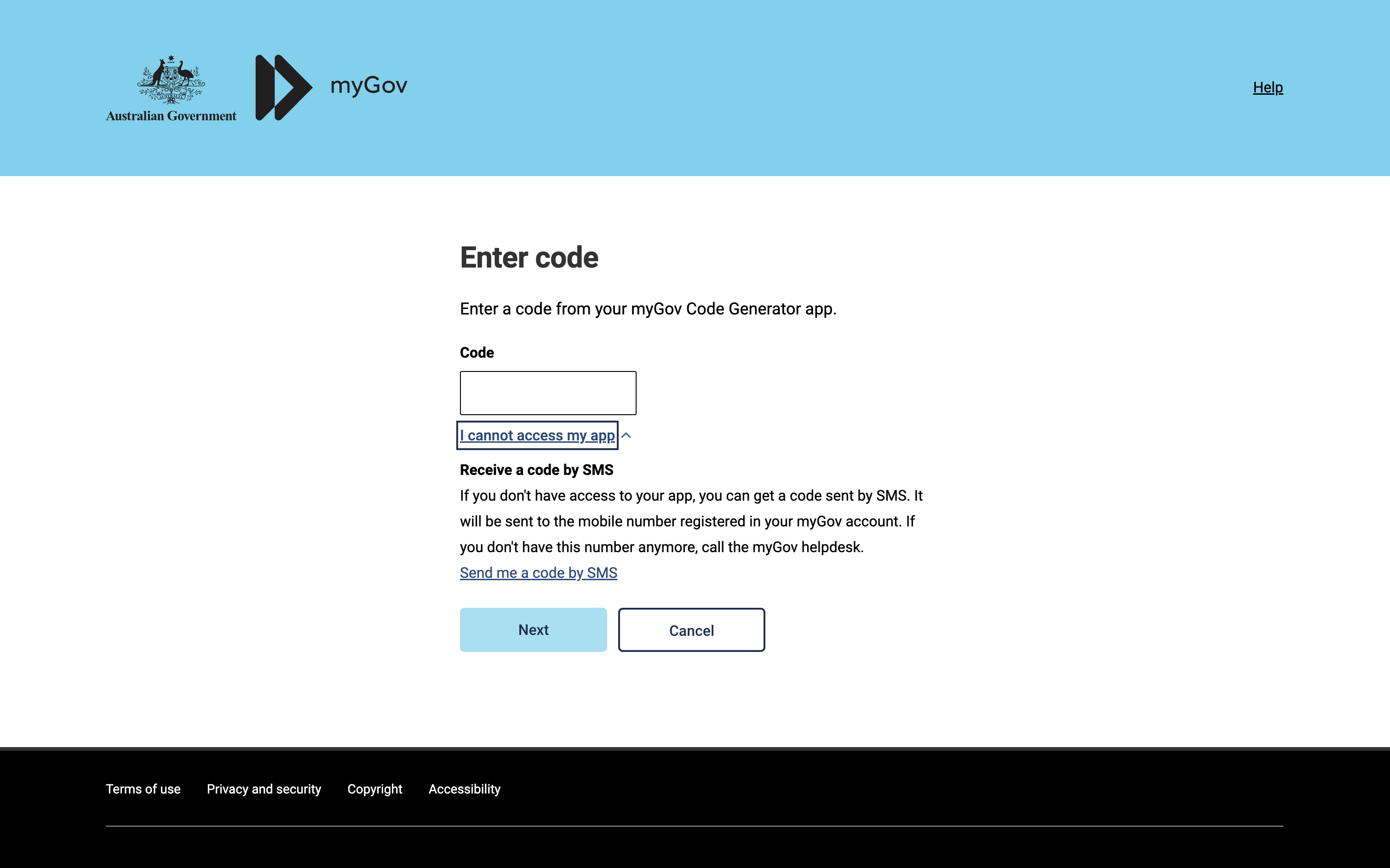 기본은 myGov Code Generator app으로 코드인증을 해야 하지만, 번거롭기 때문에 Send me a code by SMS를 클릭 후 문자로 인증해줍니다.