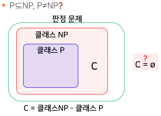 - 클래스 NP → 비결정론적 튜링 기계를 이용하여 다항 시간에 해결할 수 있는 모든 판정 문제의 집합
