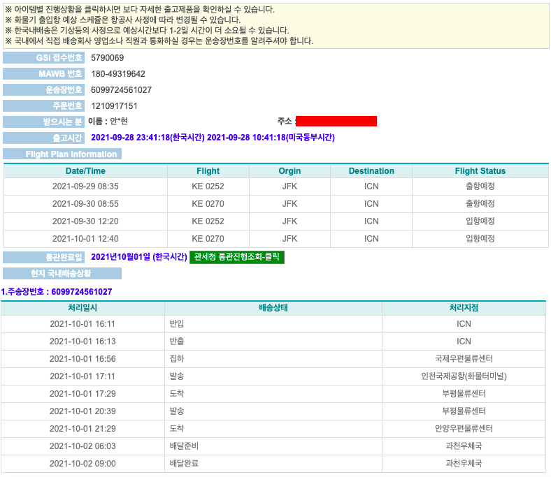세관신고후 10월 2일에 배송을 받았기때문에 총 2주정도 걸린 것 같다.