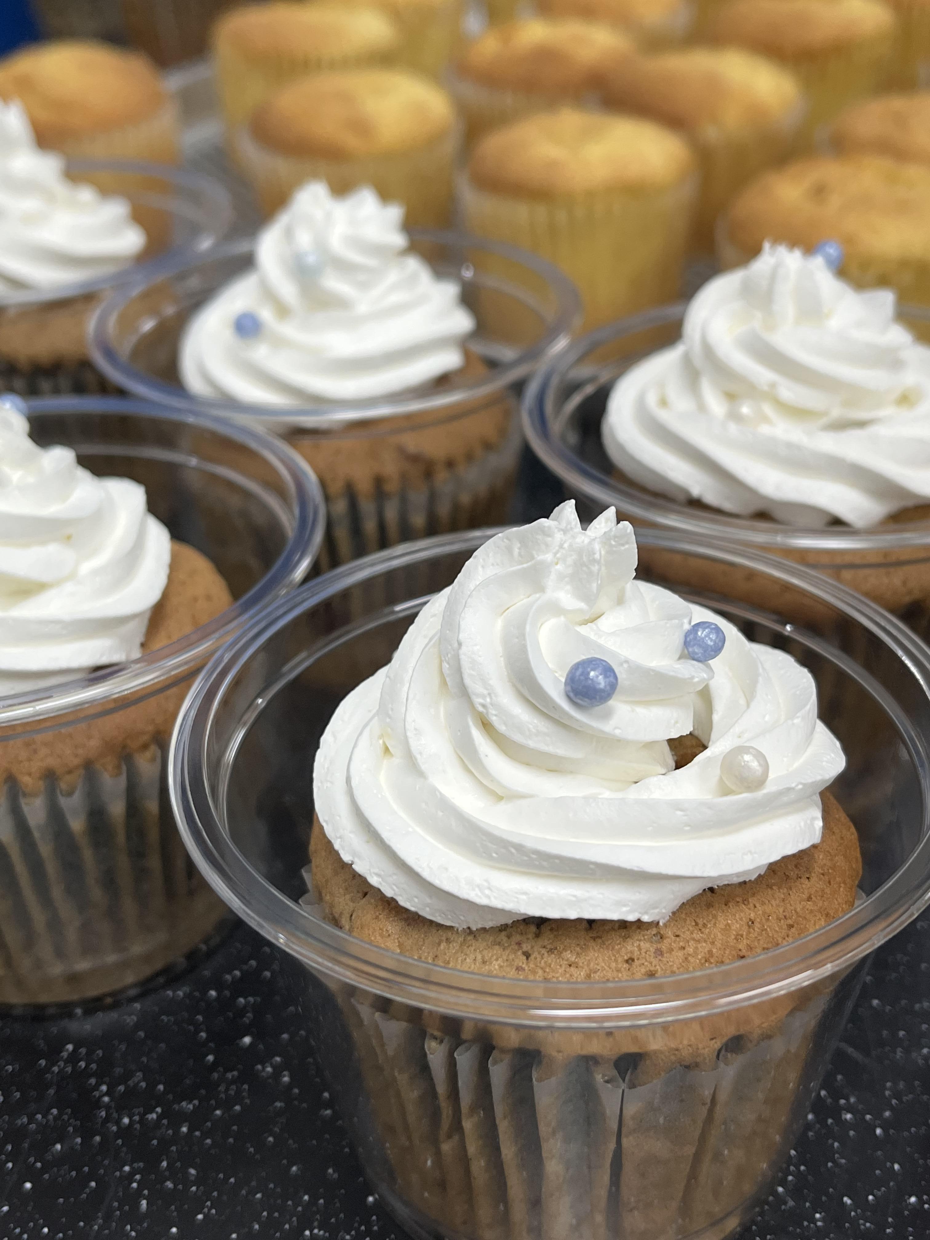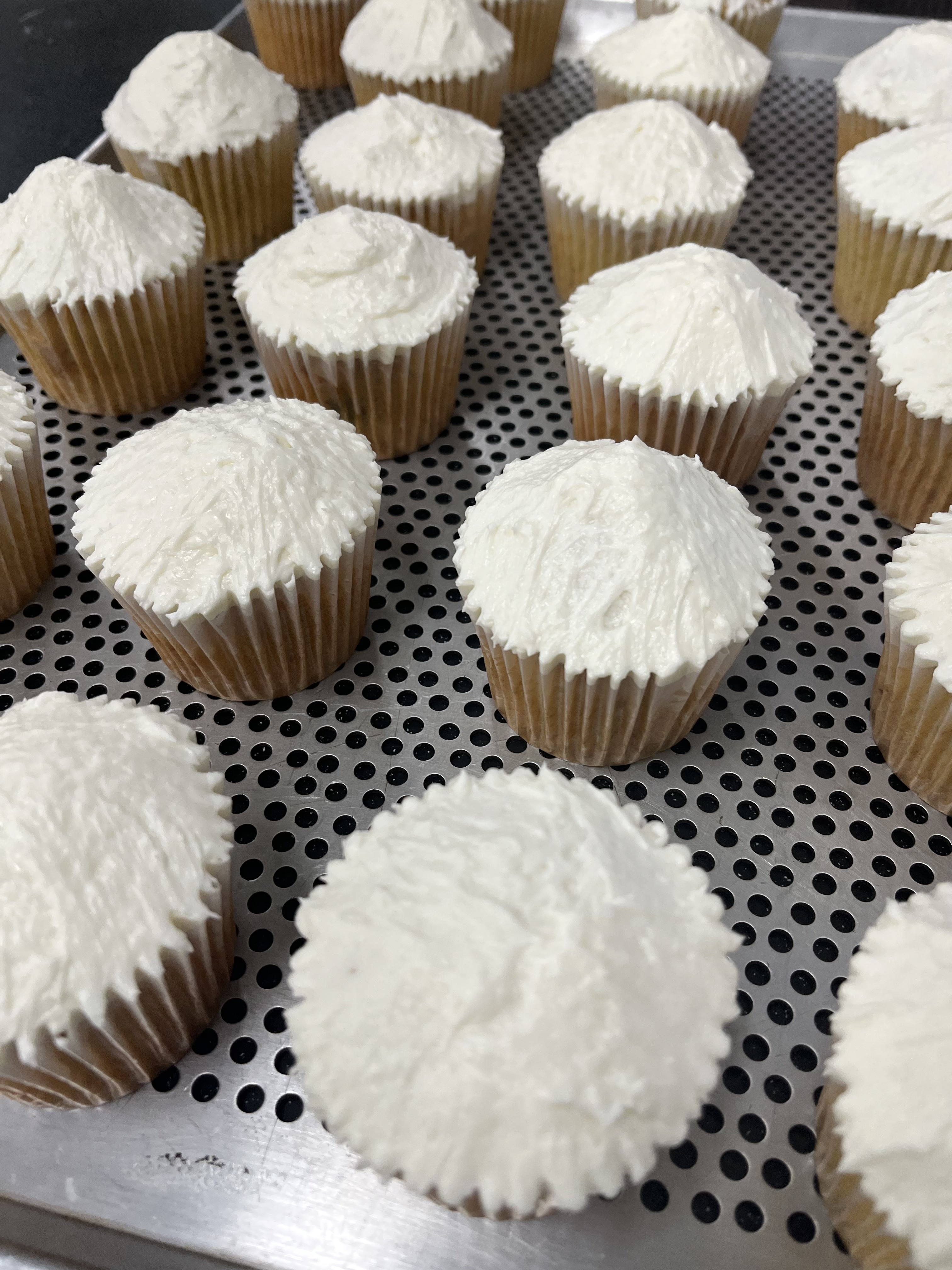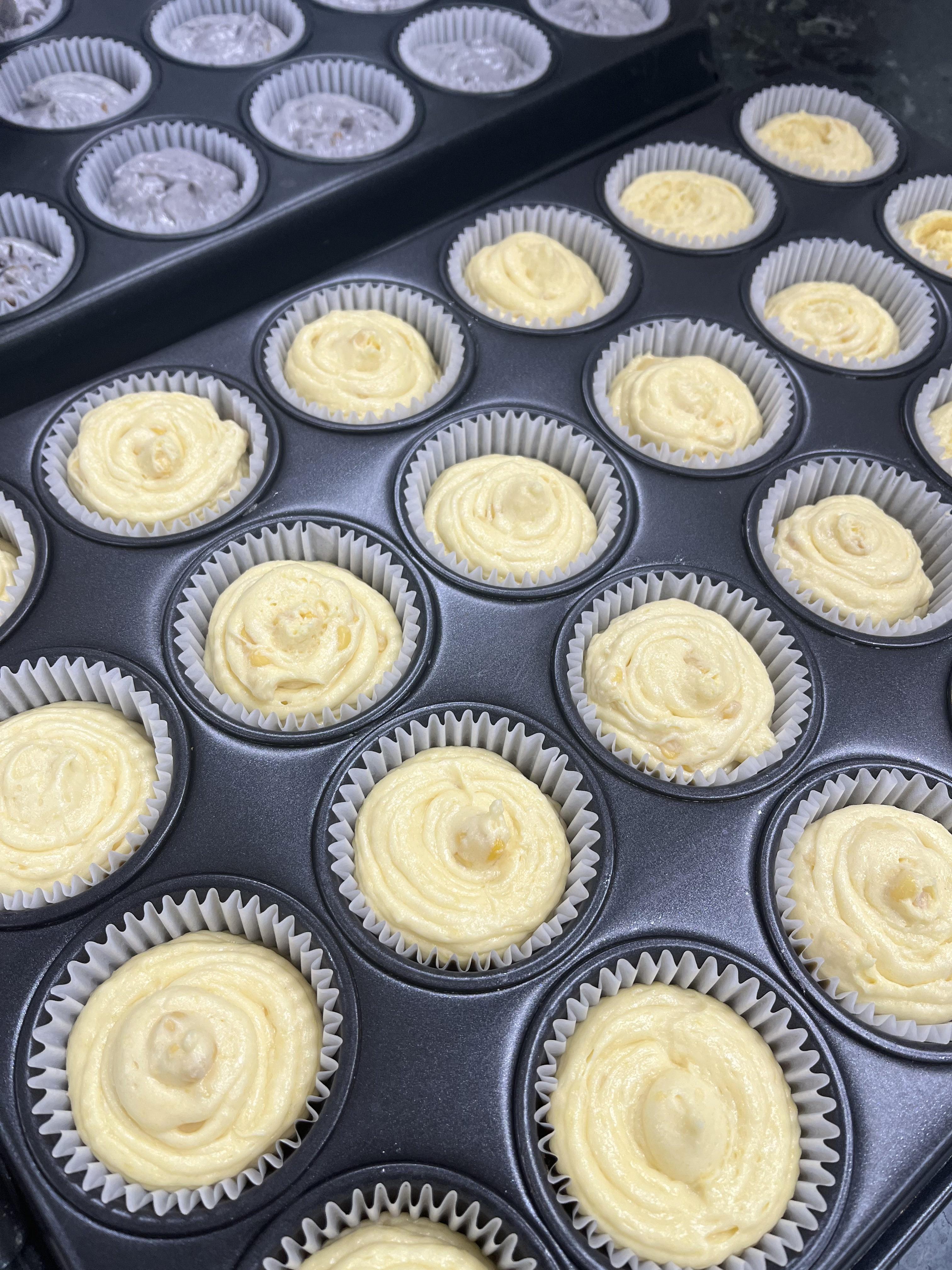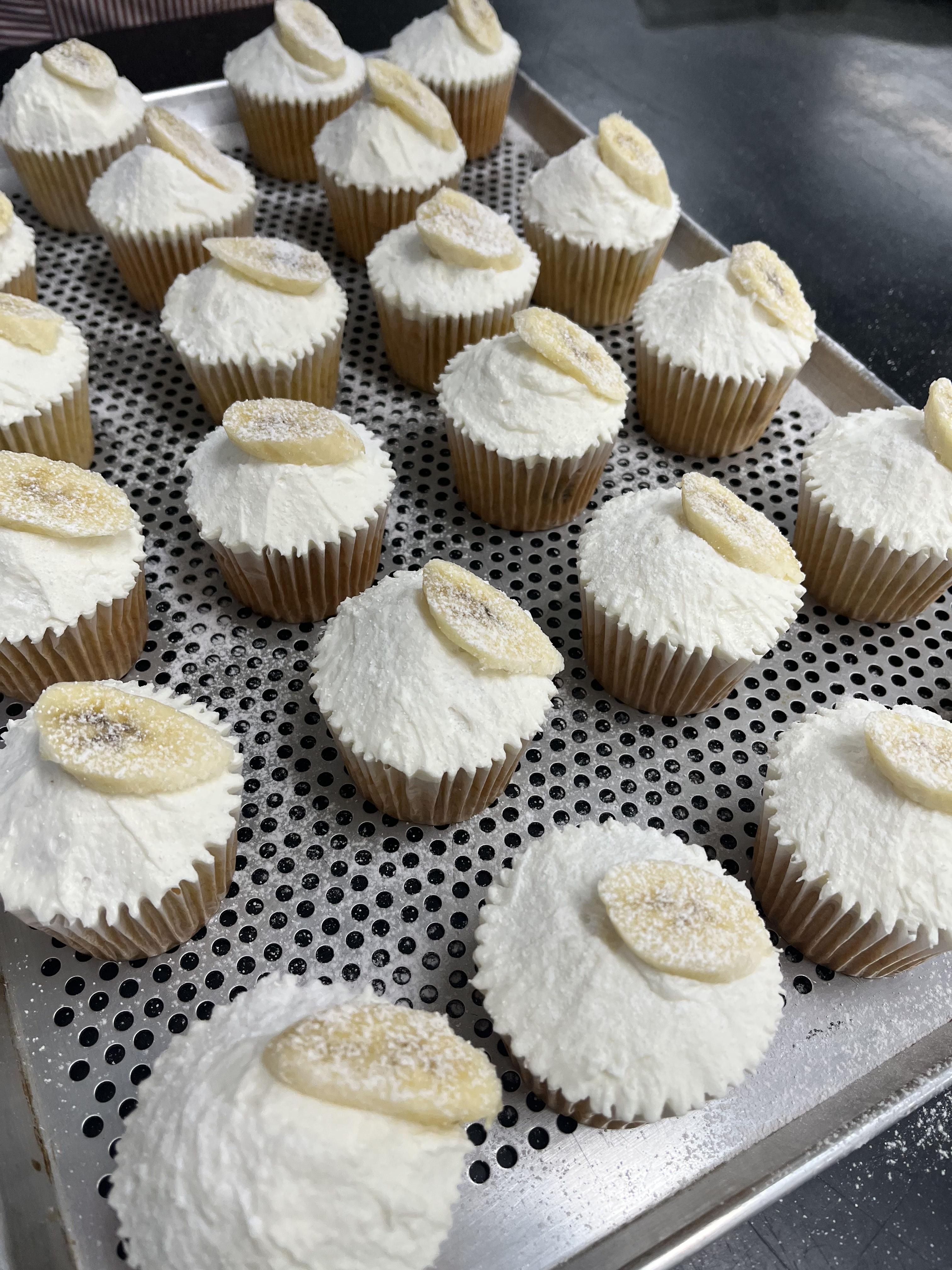 같은 배합으로 반죽을 만들고 안에 들어가는 속재료 내용물만 달리해서 크림을 얹고 위에 가니쉬를 예쁘게 해주면 각각 아몬드, 바나나 컵케이크🧁 완성