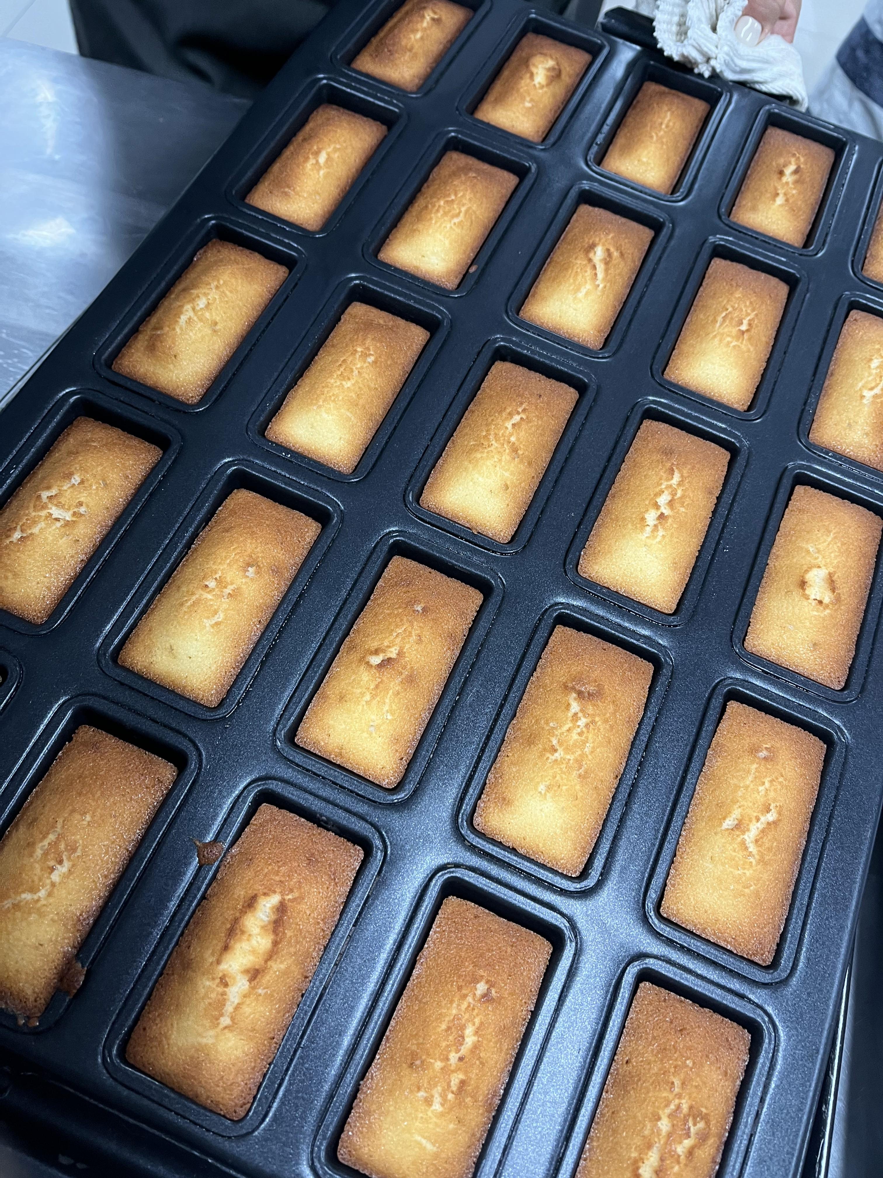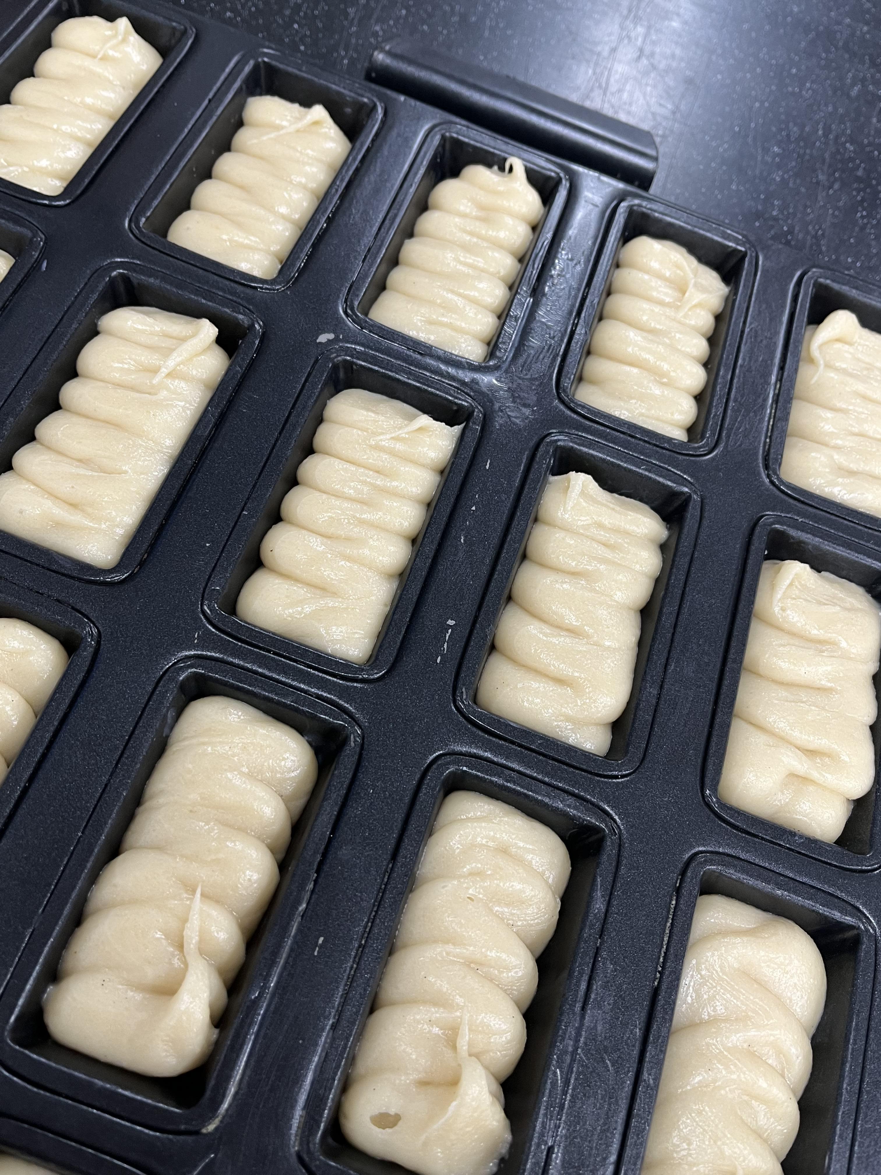 오후에는 잘 휴지된 휘낭시에를 이렇게 휘리리릭 짜주고 금괴같이 골든 브라운색이 나올 때까지 구워줍니다.