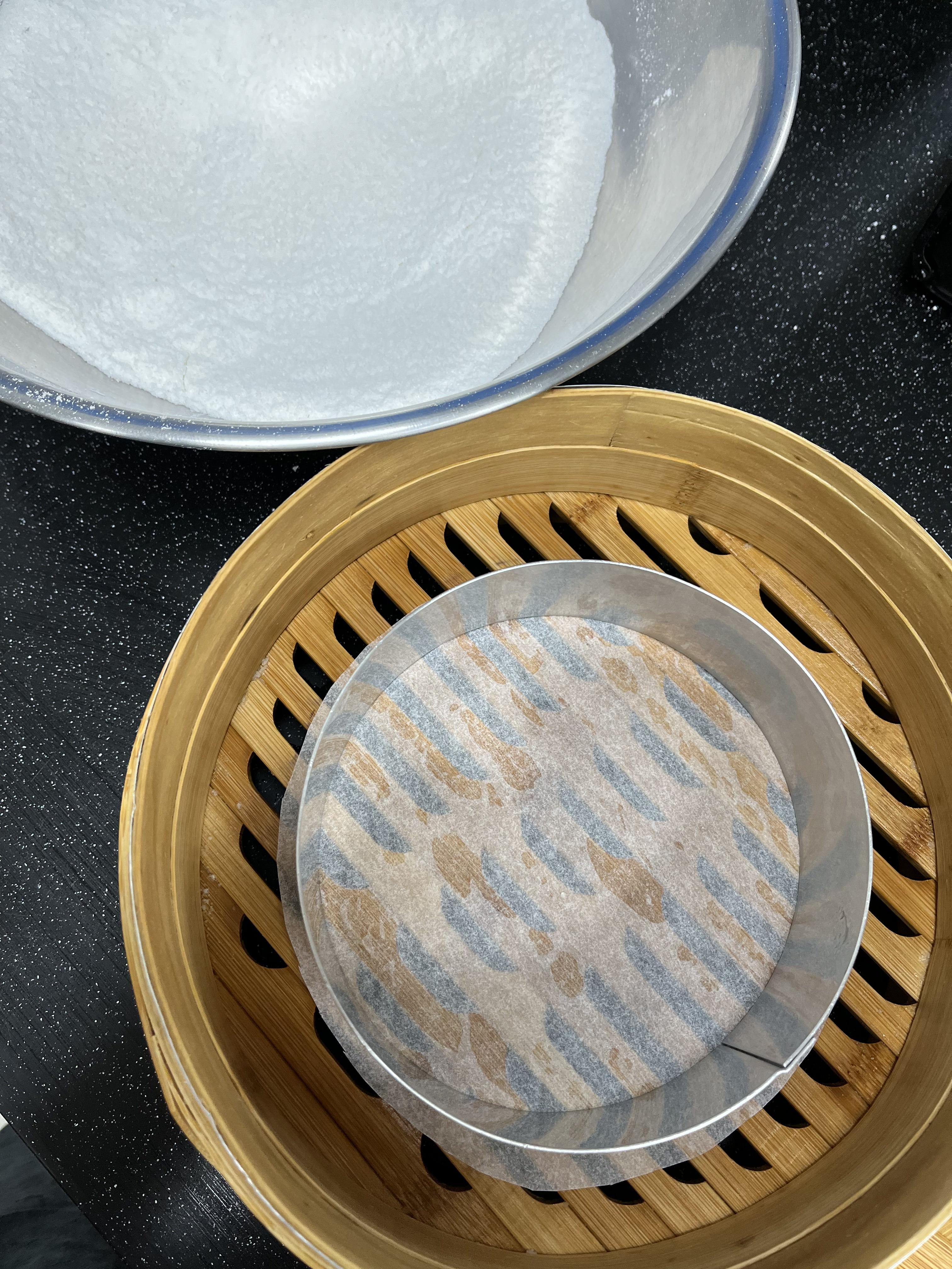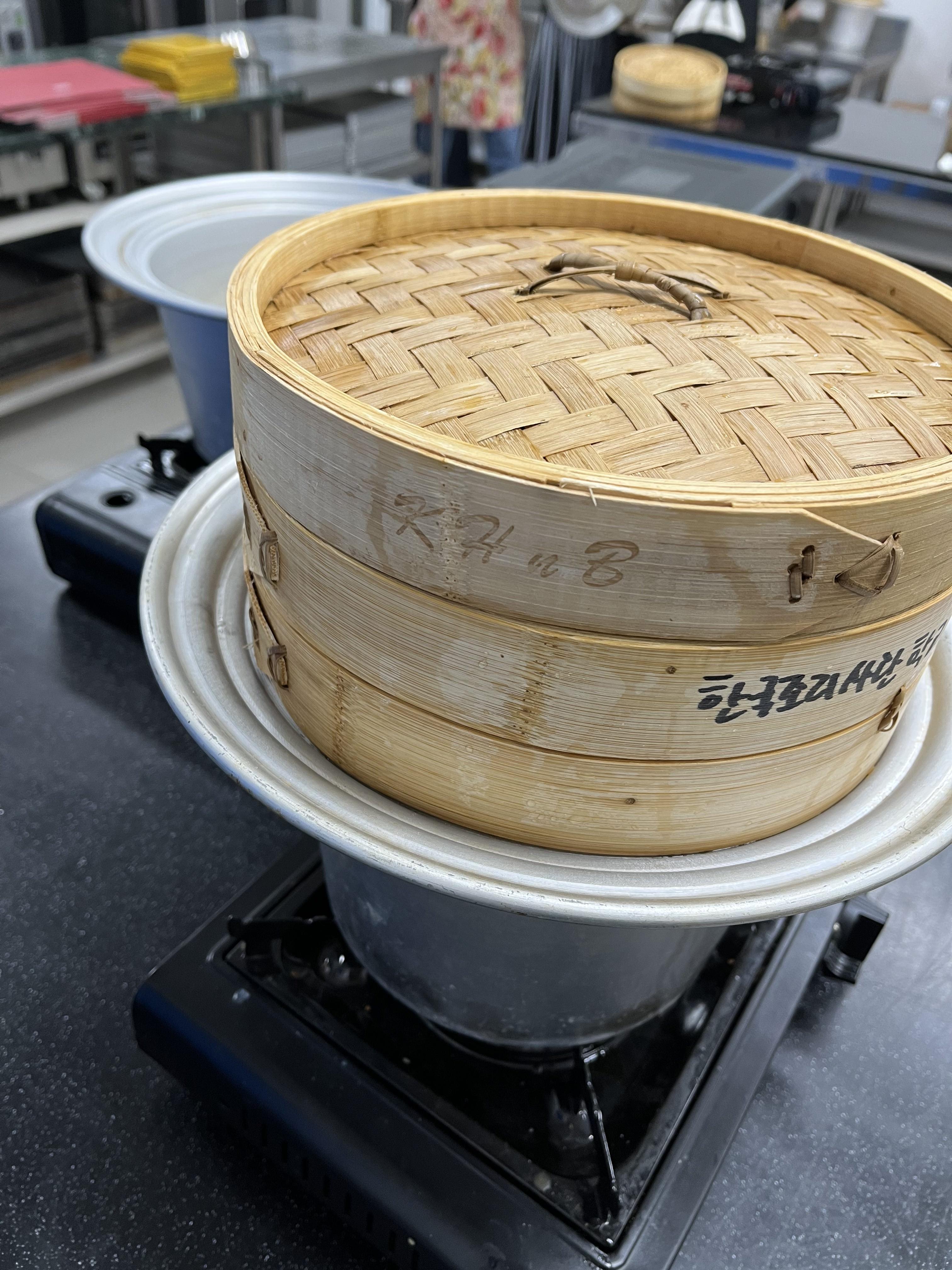 도착하자마자 대나무 찜기를 물에 푹 담가준 뒤, 떡을 쪄 줍니다. 그래야 늘러붙지 않고 예쁘게 쪄진다는 게 선생님피셜-