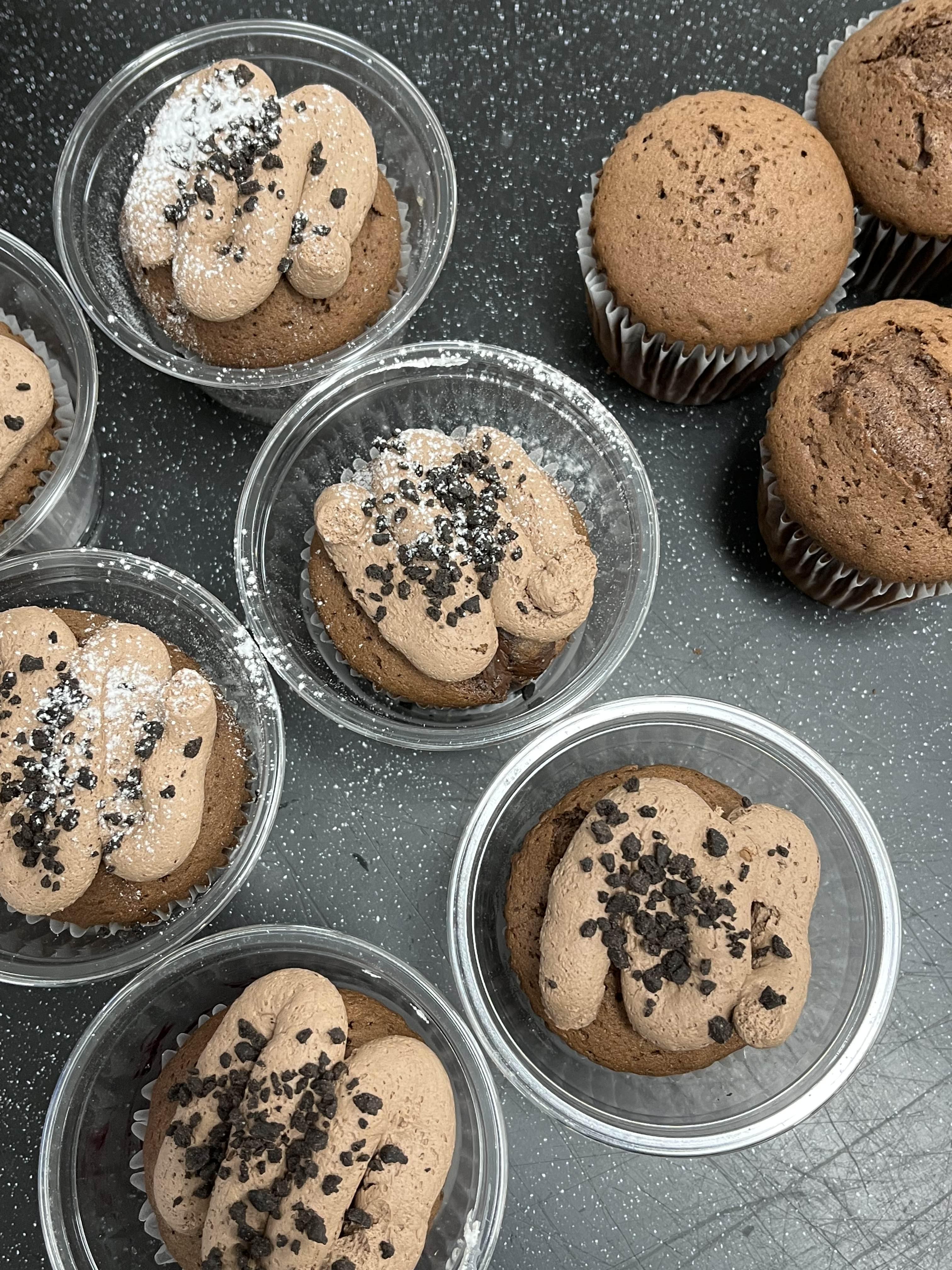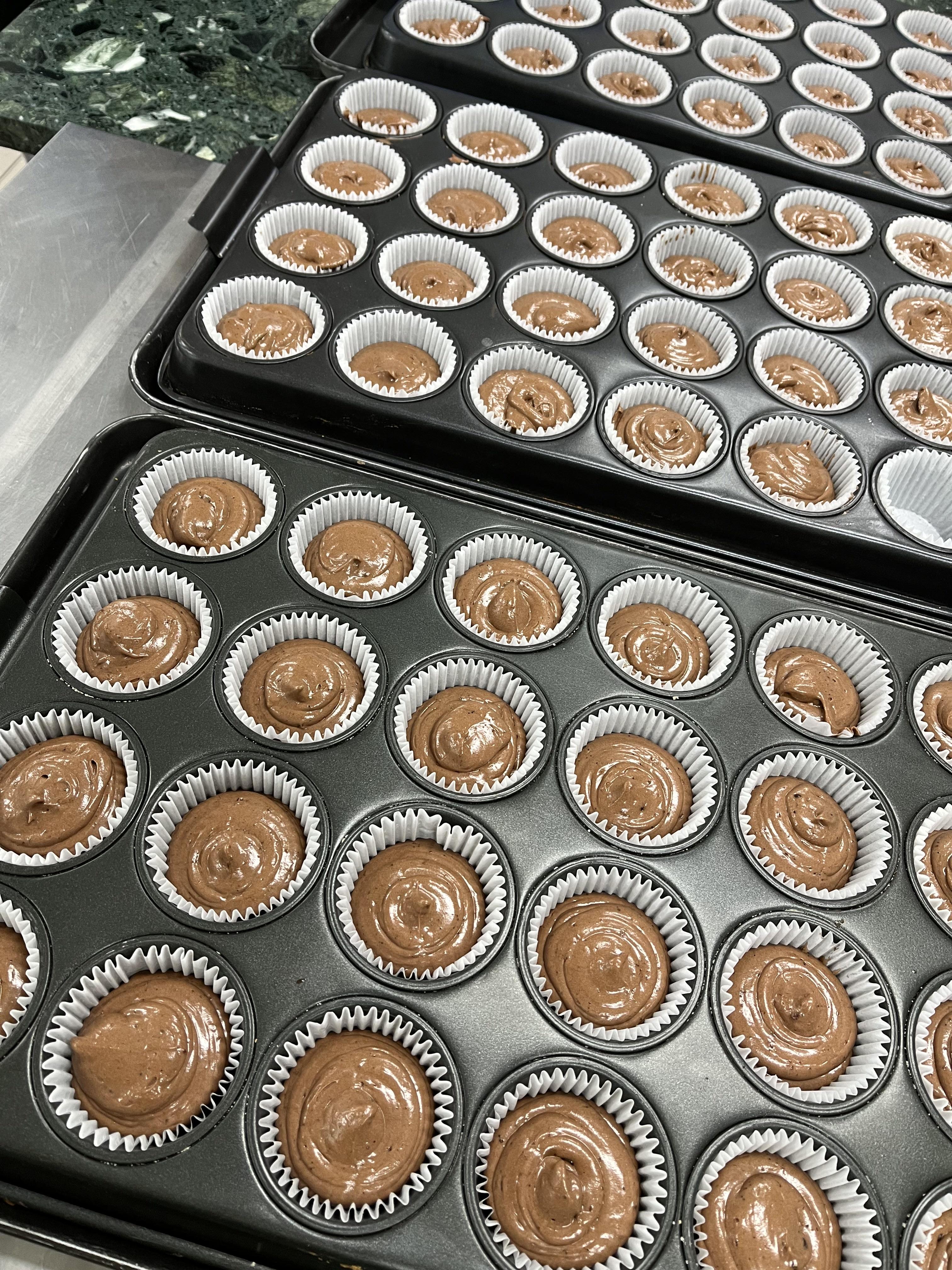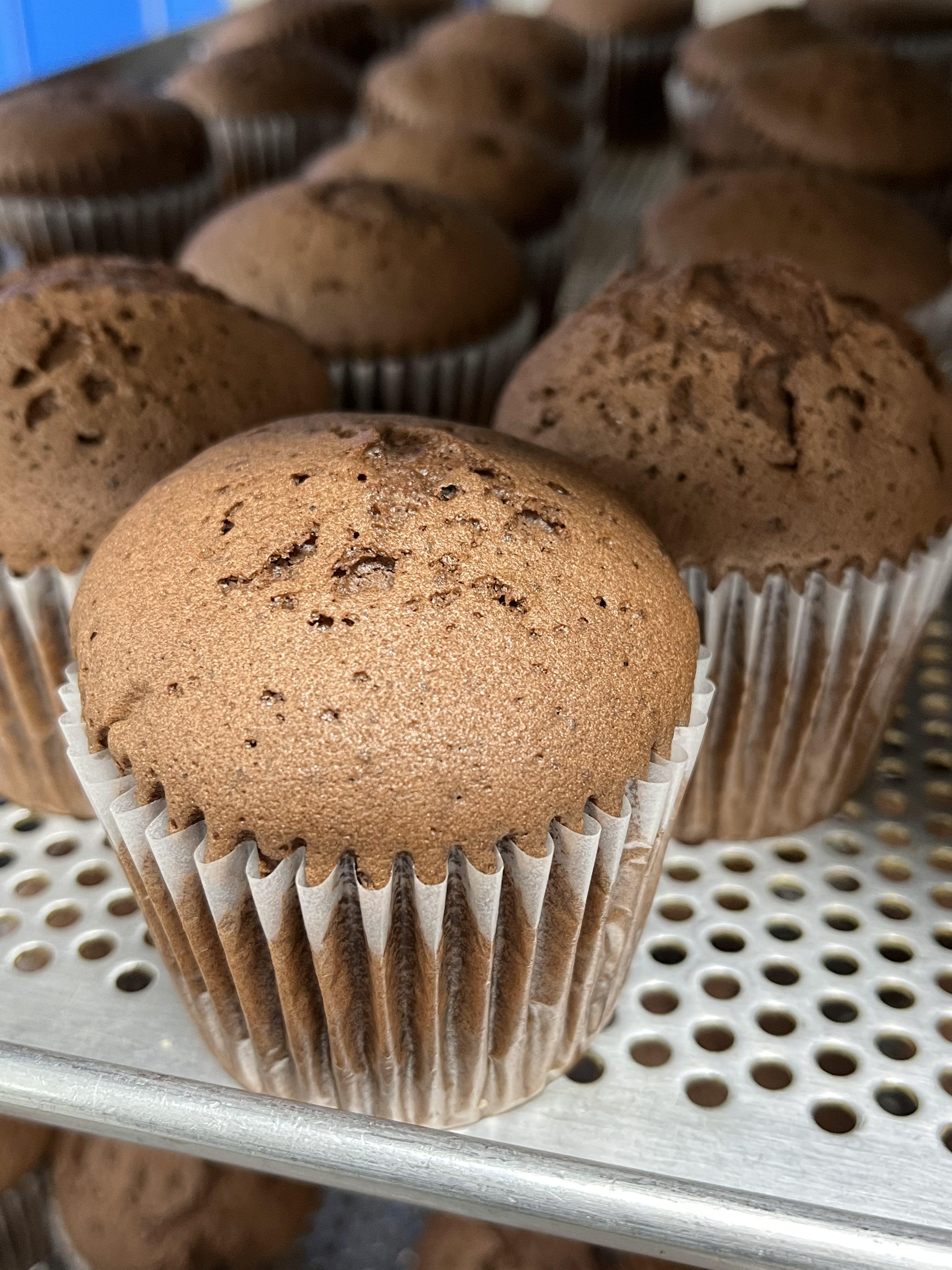 초콜렛 컵케이크 재료: 버터 930g, 설탕 900g, 소금 8g, 달걀 26개, 박력분 920g, B.P. 36g, 코코아분말 120g, 초코칩 280g, 우유 160g