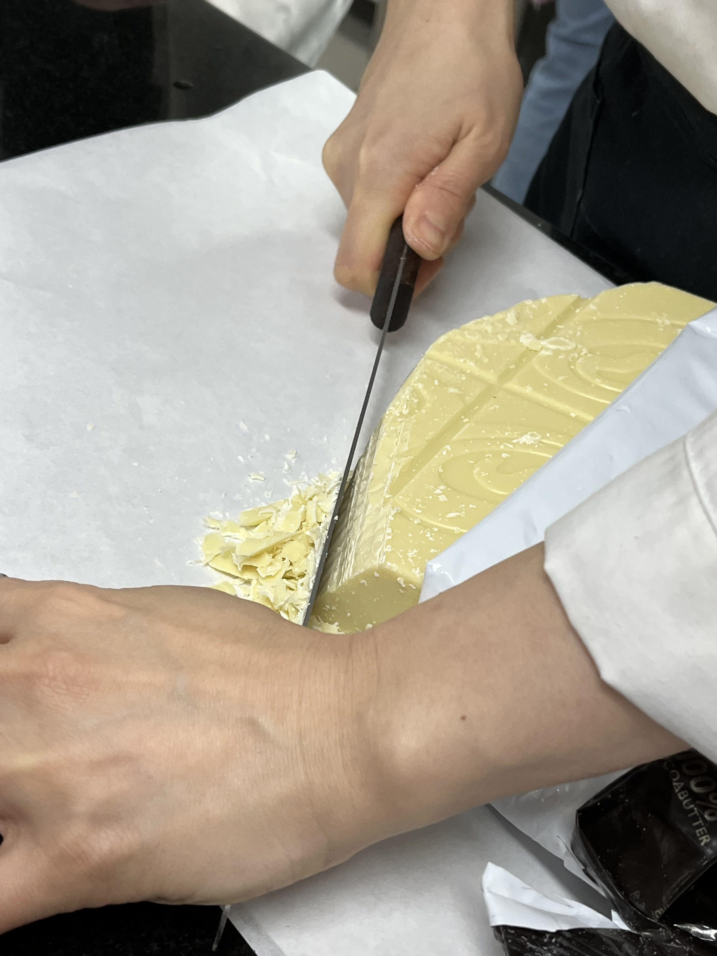 위에 올라가는 화이트 커버쳐 아이싱은 초콜렛 블럭을 이렇게 힘껏 썰어주고 가나슈를 만들어 준 뒤,