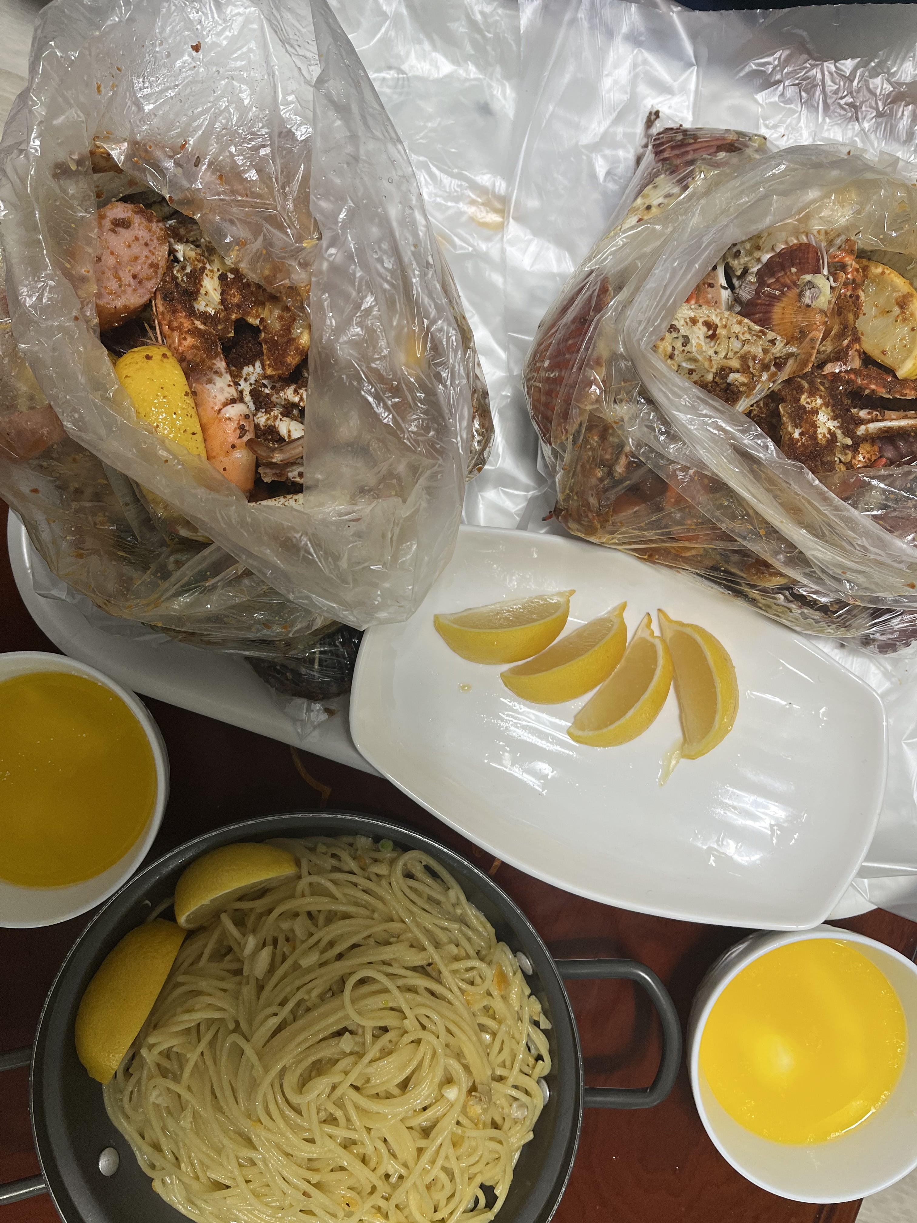 이때 추가하면 좋은 것들은 소세지, 레몬, 감자, 옥수수 등등 그리고 마무리로 갈릭 버터 파스타까지 미리 준비해둔 뒤, 다 먹은 양념소스에 후식으로(?) 비벼먹으면 배땅땅 모두가 만족하는 식사 완성