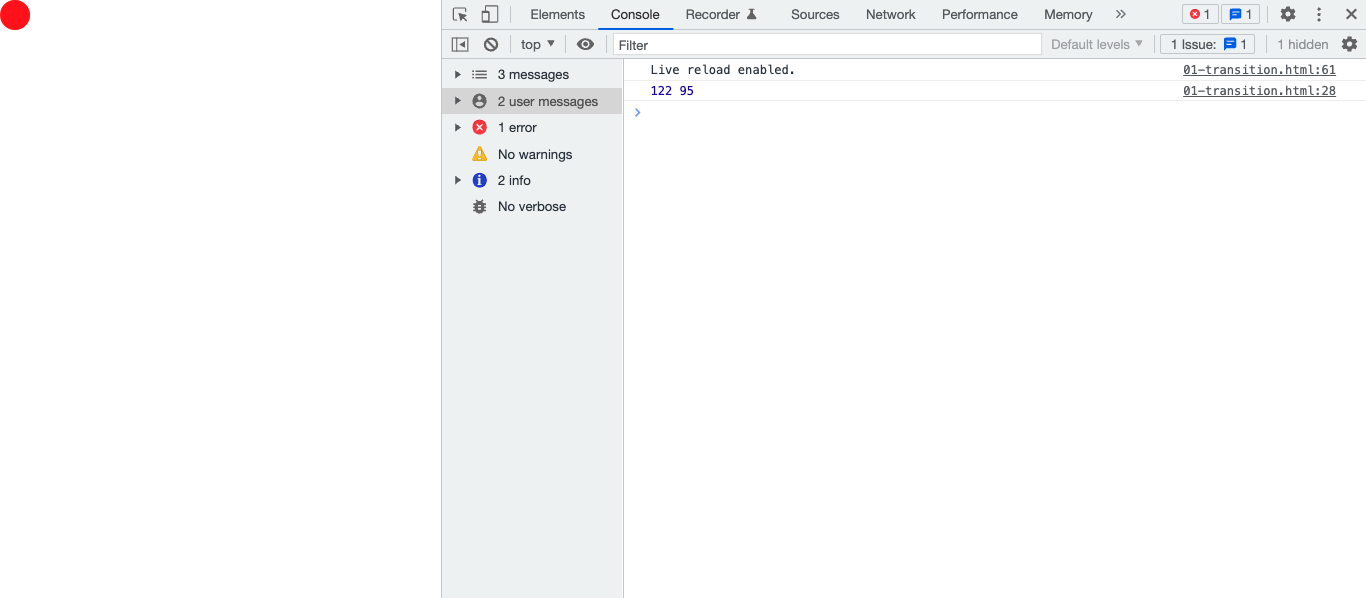 ballElem의 style.transform안에서 앞서 확인해본 clientX와 clientY 값을 통해 빨간 공의 위치를 이동시켜준다.