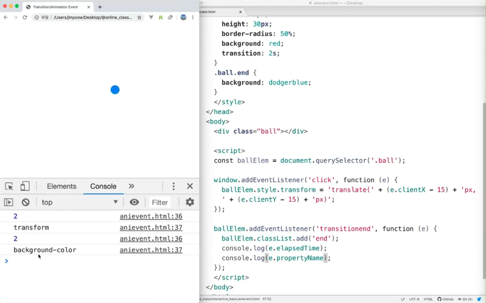 하지만 강사님 말씀에 따르면 정황상 transitionend가 쓰일 경우가 훨씬 많기 때문에 예제에서도 transitionend로 진행했다.