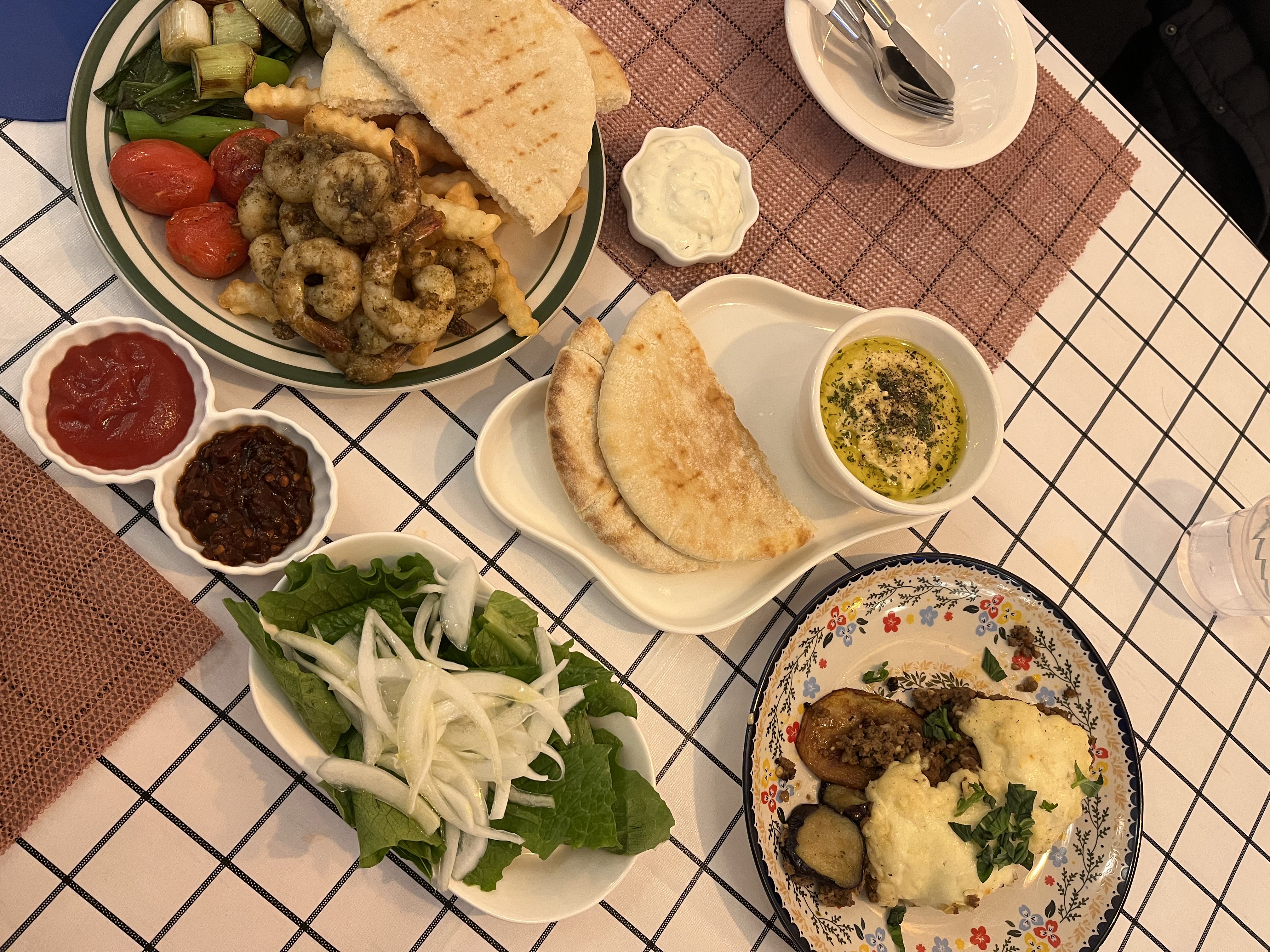 보통 사장님이 서빙하고, 주문받고, 요리하고, 계산까지 해주는 1인 매장을 좋아하는 편인데, 왠지 조금 더 신경 써주시는 그런 느낌이 든다. 그리스마스도 마찬가지. 주문할 때부터 어떤 식으로 세트메뉴를 먹으면 조금 더 싸다라고 친절하게 알려주시고 헤비한 듯하지만 주문했던 쉬림프 수블라키, 무사카, 후무스 모두 먹었을 때 너무 기름지다 라는 느낌이 아닌 산뜻한 그릭요거트를 먹는 그런 건강한 맛이라 헤비한 크림맛에 질려버린 연남동민들은 그리스마스에서 건강한 한끼 챙겨먹어도 좋을 것같다.