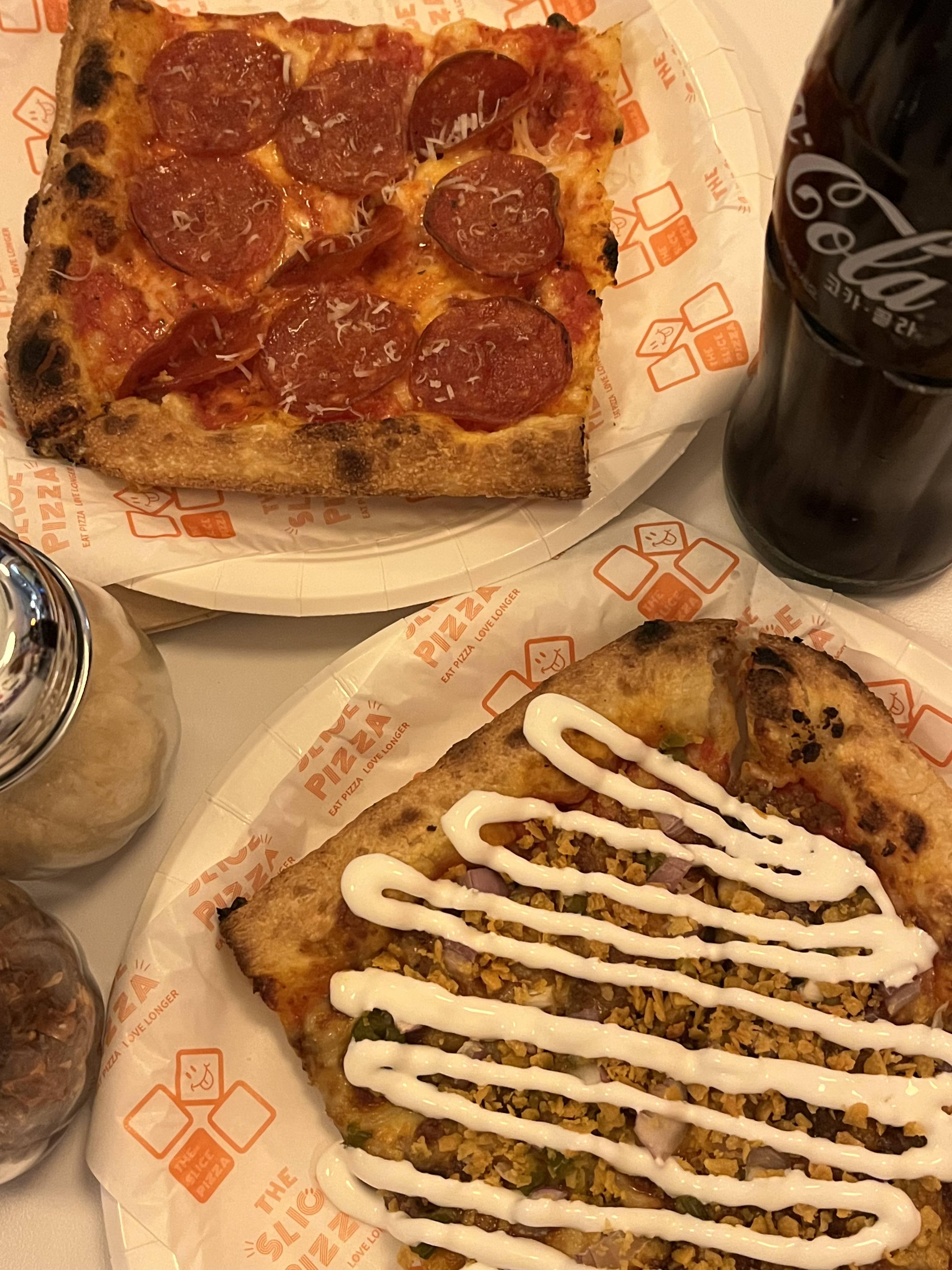 내곁엔 24시간 배가 고프신 분이 있어 들렸던 집가는 길에 모퉁이 피잣집. 작은 컨테이너 같은 뉴욕 느낌 물씬 나는 외관이라던지 조각피자가 왠지 향수병드는 기분이었는데, 테이블 위에 무심하게 올려둔 스리라차, 핫소스, 치즈가루가 진짜 그 느낌 그대로. 혼자 일하시는 건지 수저나 기타 등등 셀프 서비스였지만 정말 딱 한 슬라이스 얼른 배어물고 가기 좋았다. 하지만 1불짜리 싸구려 뉴욕 정통 스트릿 치즈피자가 그립다.