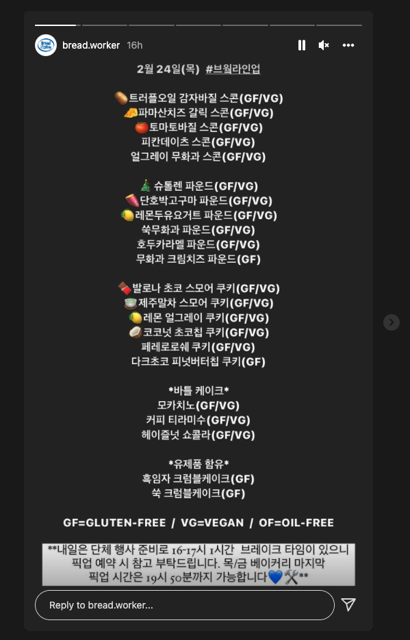 인스타 업데이트를 자주 해주셔서 그날 굽는 빵을 공지해주시기 때문에 미리 확인해볼 수 있다는 게 큰 매력.