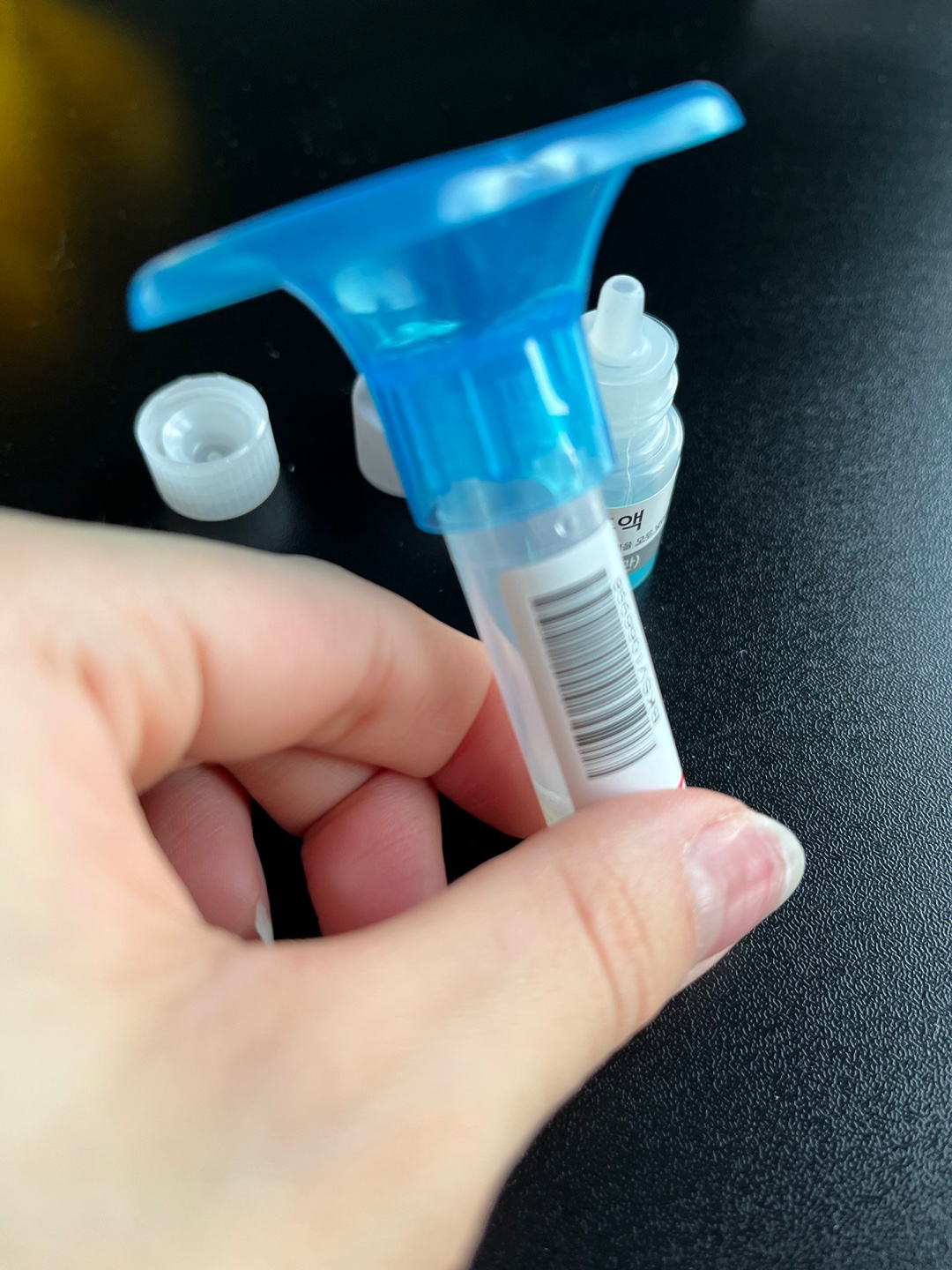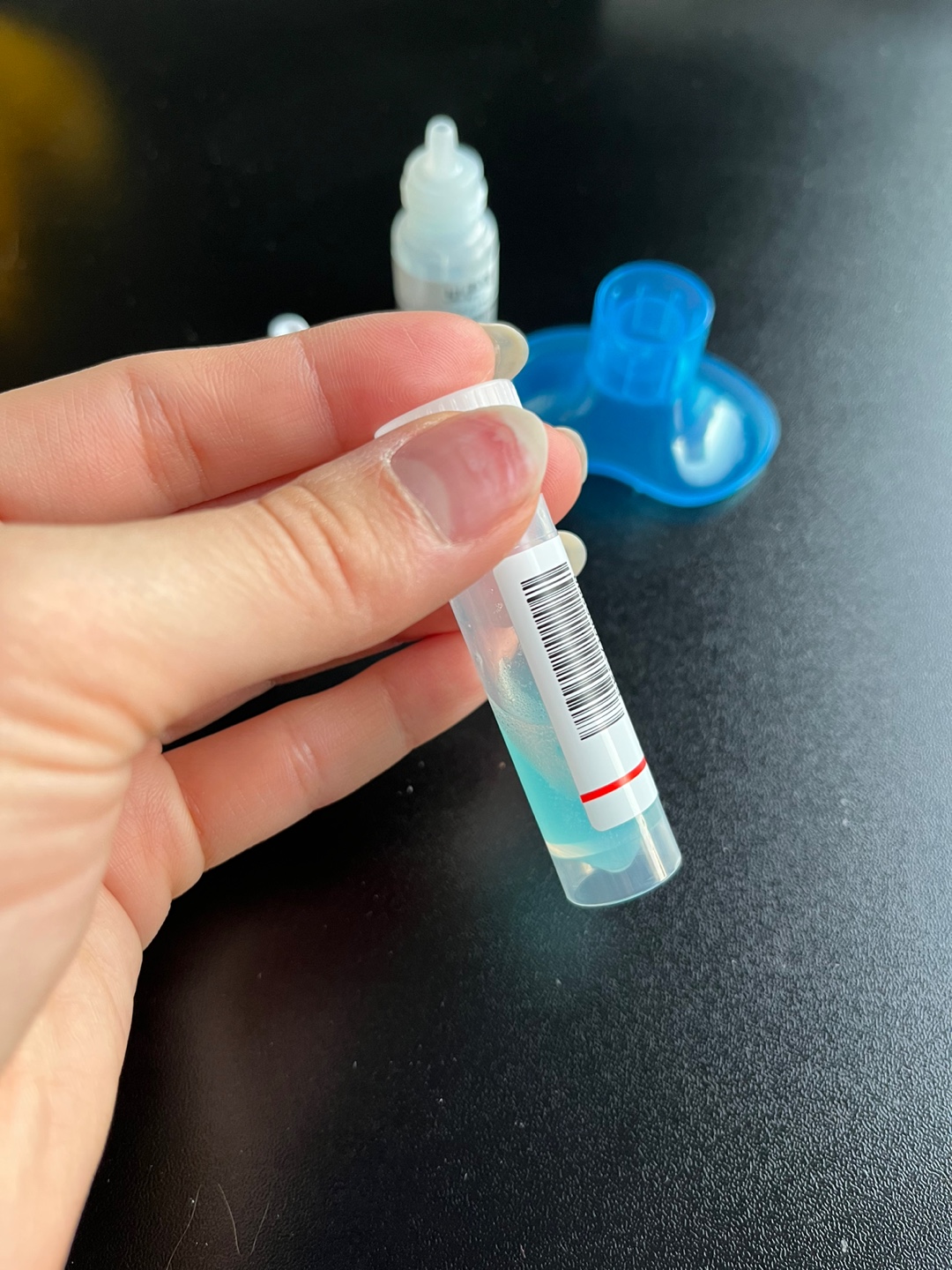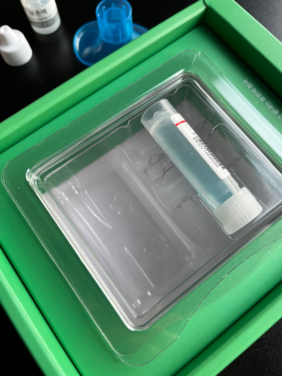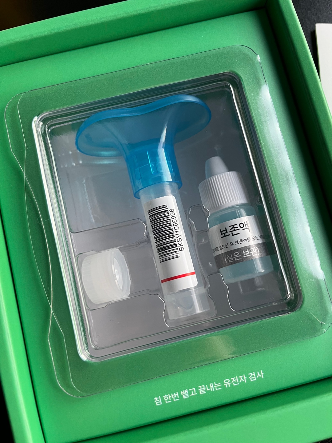 뚜껑을 따고 침을 일정 선까지 모아준뒤, 보존액을 쭈욱 넣어주고 잘 흔들어준뒤, 밀봉해줍니다.