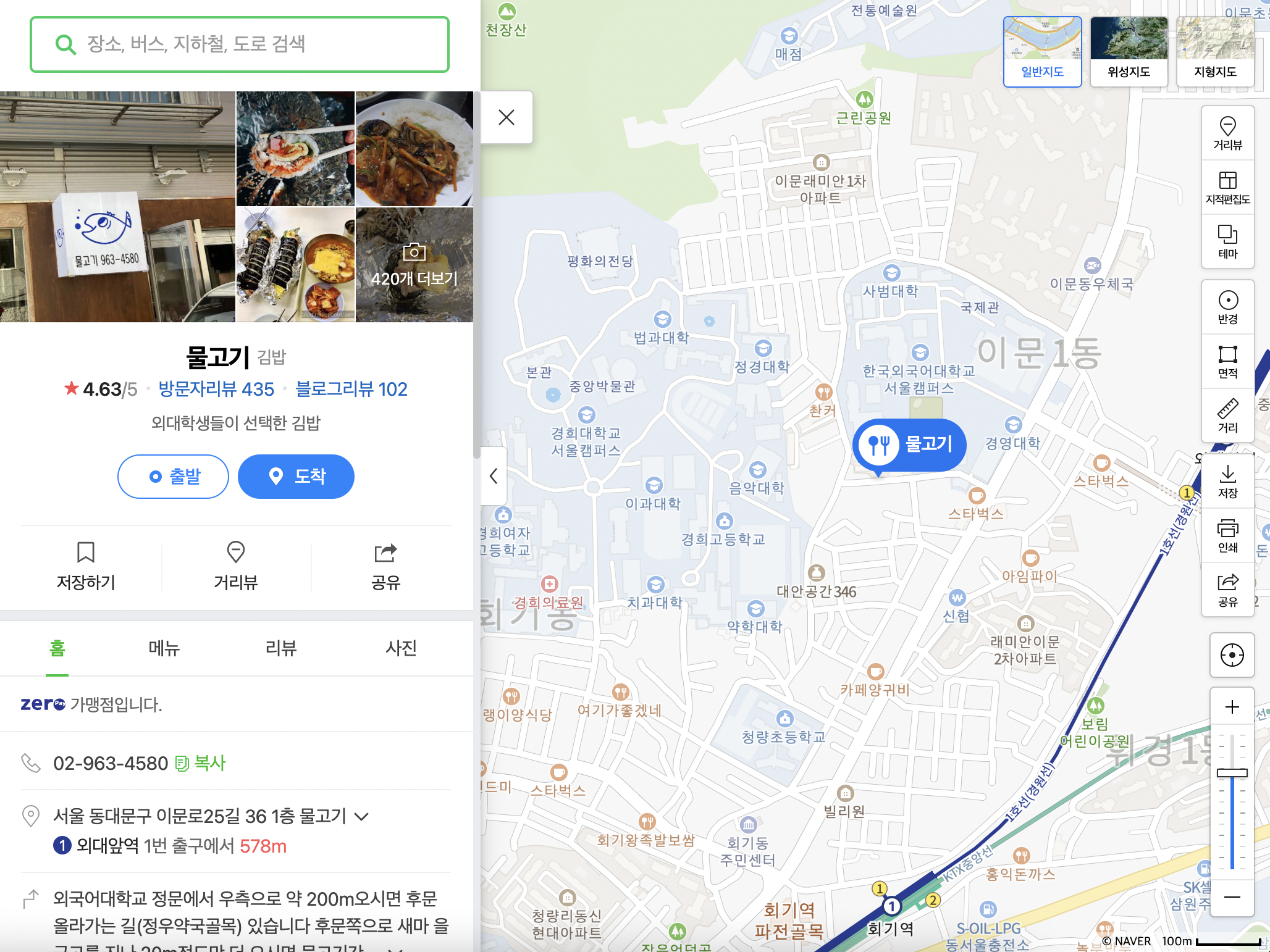 김밥이 맛있는건 여대앞이 문제가 아니였나보다. 외대앞에도 유명한 물고기라는 분식집이 있는데, 여기 김밥이 그렇게 맛있다고. 미리 전화주문을 해야하고 고추간장을 꼭 챙겨야한다고 한다.