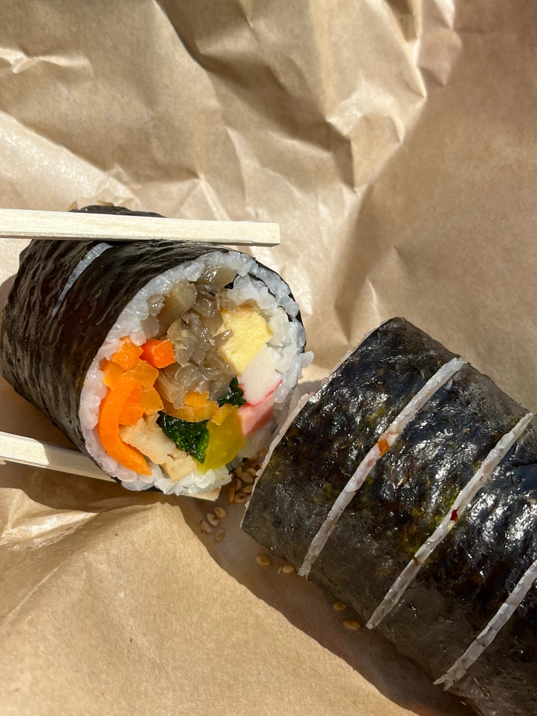 여기도 추천씨게하고싶은 김밥맛집. 아낌없이 통으로 들어간 참치양으로 놀라게 하는 참치김밥도 맛있는데 네모난 지단이 잔뜩 들어간 봄날김밥이 남자친구도 입에 들어가기 전부터 고소한내가 맛집스멜이라고 칭찬해버림. 좋은 참기름을 쓰시는 건지 밥이랑 고소한 재료들과 서로 어우르면서 잘 어울러지는 찐 맛집이라 미리 네이버 주문넣고 준비시간 맞춰서 포장가져오면 알맞게 즐길수있다.(키오스크도 가능. 하지만 평일에도 대기가 30분정도 있는편) 매장 취식은 안되고 배달과 포장만 가능하다.