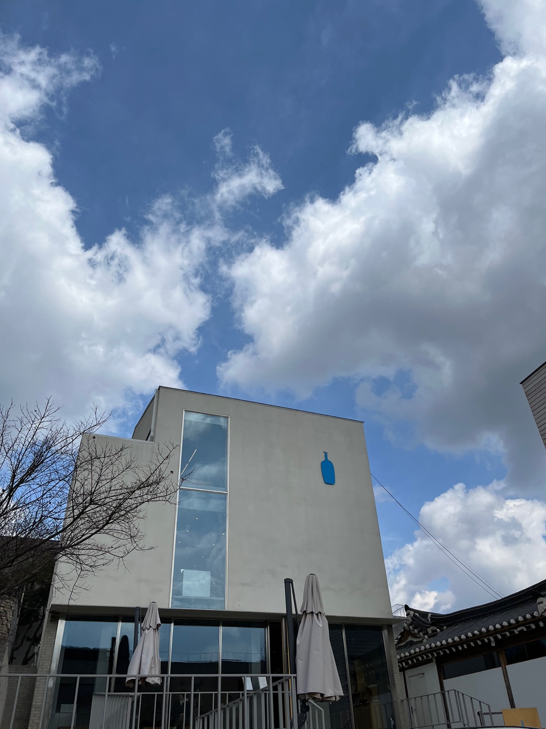 날씨가 맑아서 그런지 콘크리트 건물과 블루보틀의 아이코닉한 로고가 잘 어울린다!