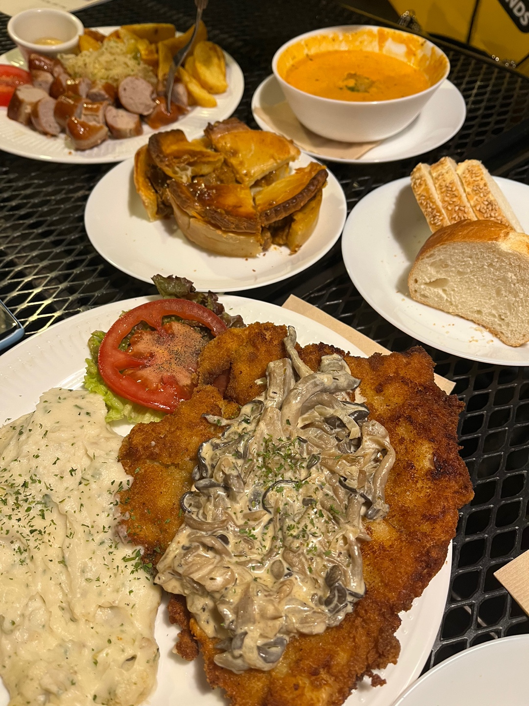 그래서 토론 끝에 우리가 주문한 음식은 예거슈니첼, 부어스트 그리고 양고기 핫파이와 빵, 오늘의 스프