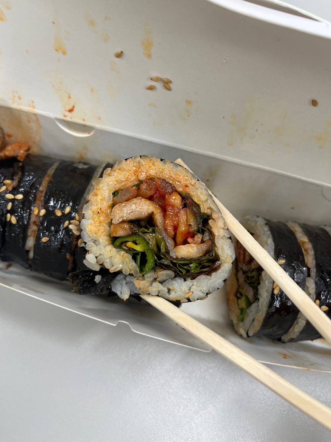 원석삼겹살 김밥은 이름그대로 두툼한 삼겹살을 넣고 만 삼겹살 김밥인데 무말랭이와 깻잎이 재료로 들어가있어 삼겹살의 기름맛을 중화시켜주는 것 같아요.